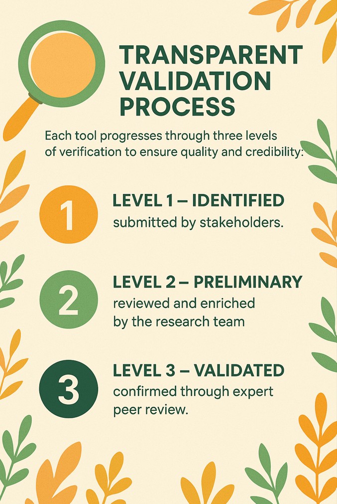 This open and participatory validation workflow guarantees accuracy, transparency, and continuous improvement, turning Tools4Nature into a living, community-driven resource that evolves with scientific knowledge and real-world practice.